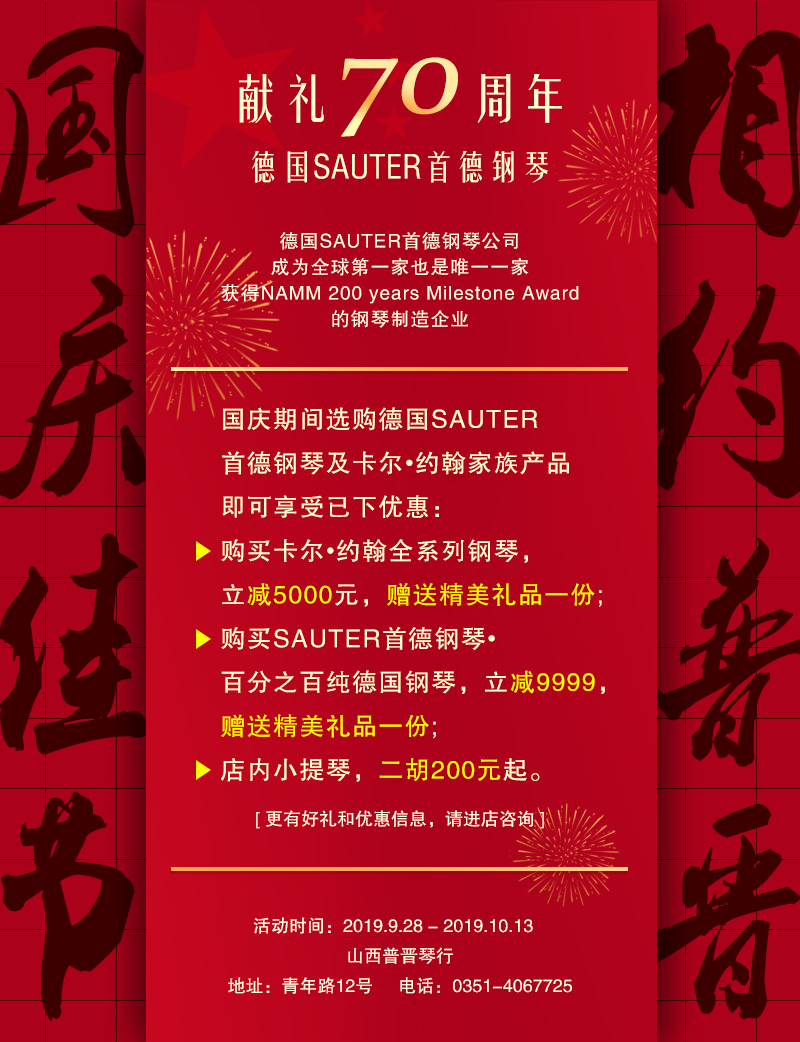 2016年11月10-12日,普晉琴行與九歌琴行將聯(lián)袂為省城的古典音樂(lè)愛(ài)好者奉上一場(chǎng)經(jīng)典的視聽(tīng)盛宴,我們有幸通過(guò)貝希斯坦鋼琴官方邀約到了古典音樂(lè)界的傳奇大師希普林•卡薩利斯,將在三天內(nèi)舉辦涵蓋音樂(lè)會(huì)、大師課、藝術(shù)沙龍等多種形式的音樂(lè)活動(dòng),這也是繼“2016 晉歌音樂(lè)藝術(shù)季”后普晉琴行攜手九歌琴行又一輪重磅活動(dòng)。
