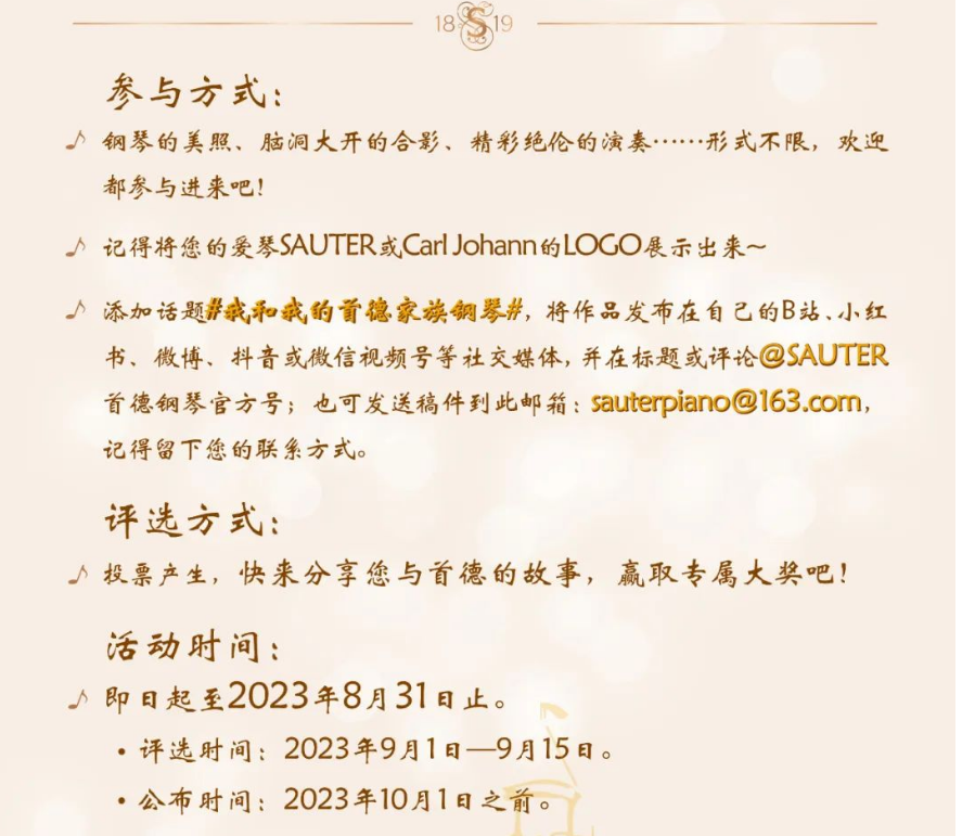 ④添加話(huà)題 #我和我的首德家族鋼琴# 發(fā)表在您的個(gè)人社媒頻道,并在標(biāo)題或評(píng)論@首德鋼琴官方號(hào);或也可發(fā)送稿件到此郵箱:sauterpiano@163.com,記得留下您的聯(lián)系方式。